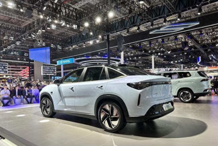 从侧面看,睿蓝7采用了双色车身的设计,黑色车顶与浅色车身形成了色差,有效降低了整车的视觉重心。此外,睿蓝7还配备了隐藏式车门把手、车顶扰流板,配合车尾的小鸭尾设计,有效地降低整车风阻系数,让睿蓝7拥有0.238Cd的优秀风阻系数成绩。