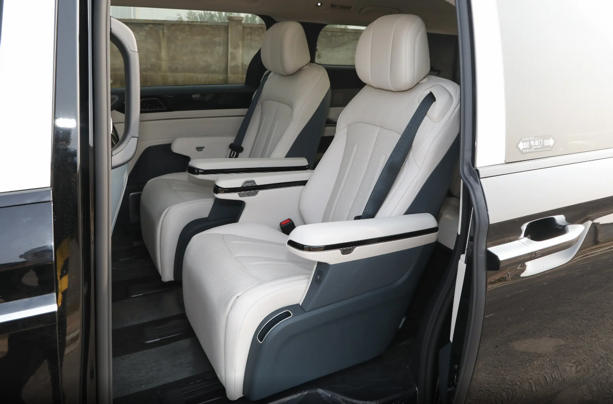 新车全系继续采用2+2+3的7座布局,“冰箱彩电大沙发”套装也继续提供,后排配有15.6英寸的吸顶屏,支持K歌功能,并还提供28扬声器的音响系统,配合5G网络,车辆在视听影音方面的表现不错,车载冷暖冰箱依旧位于中央扶手下方。