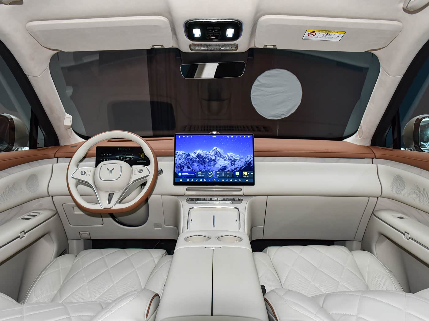 进入车内,内饰以 “山水入境” 为核心,大量运用山水意境孔纹皮革与 1.228㎡山水流韵木饰,11 处精嵌装饰呈现山形水意,头枕刺绣 LOGO 提升豪华质感。“2+2+2” 六座布局堪称核心亮点,第二排 Nappa 真皮独立座椅支持 12 向电动调节及加热 / 通风 / 按摩功能,520mm 超长坐垫提供充足支撑,180cm 乘客入座后膝部仍有两拳余量。中间 20cm 宽通道让第三排进出从容,175cm 乘客在第三排仍有一拳腿部空间,配备独立空调与 USB
