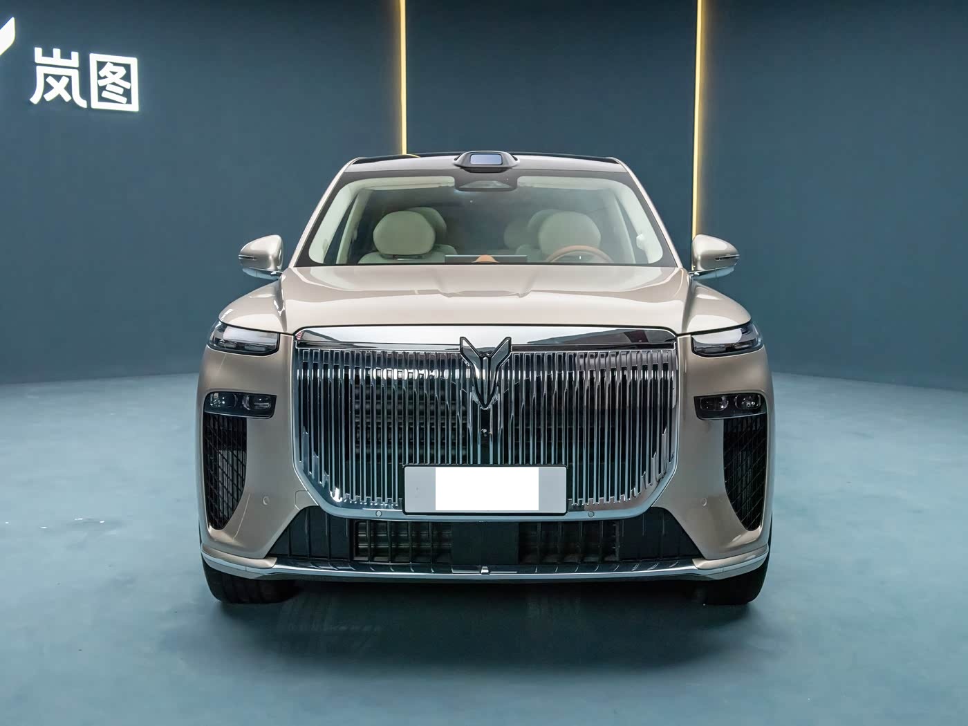我们首先来看新车的外观设计方面,岚图泰山以 “大境天成” 为设计理念,车头呈现出旗舰级的威严气场。方正轮廓搭配 34 道垂直线条构成的直瀑式格栅,镀铬饰条如流水倾泻而下,与品牌 LOGO 无缝衔接,被誉为 “岚图版库里南”,尽显中式豪华底蕴。格栅上方贯穿式纤细 LED 日行灯与下方分体式大灯形成视觉对比,灯组内置 DLP 智慧投影功能,解锁时投射专属迎宾图案,仪式感