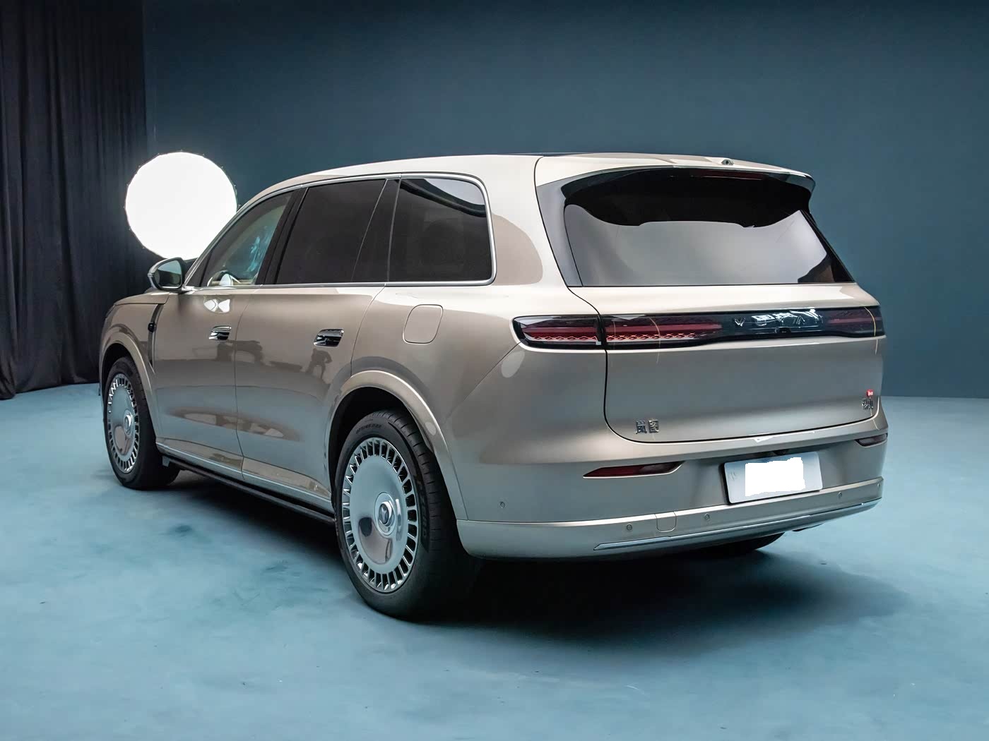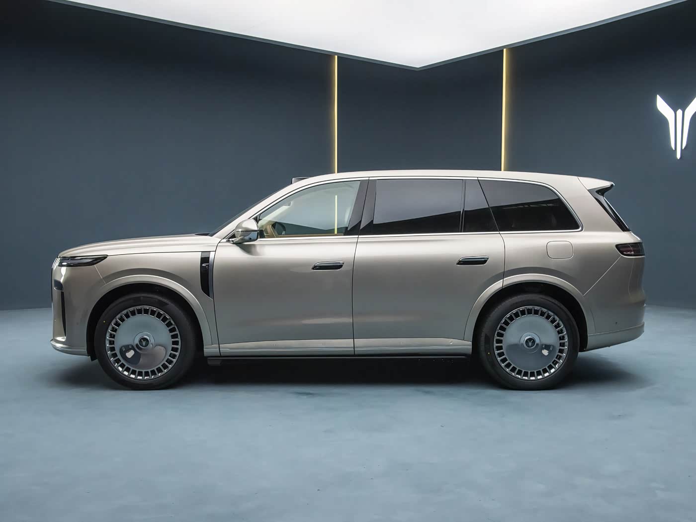 再来看车身侧面部分,车身侧面以 “山海交融” 曲面取代传统腰线,借天光造影形成动态光影效果,诠释东方美学的刚柔并济。半隐藏式星河门把手解锁时自动弹出,21 英寸多辐亮面轮毂搭配电动侧踏与迎宾展翼光毯,乘客靠近时自动激活,提升上下车便利性。5230mm×2025mm×1817mm 的长宽高搭配 3120mm 超长轴距,奠定大型 SUV 体量感,短前悬设计进一步释放车内空间。让车身既显稳重霸气,又通过流线型设计降低风阻,实现美学与实用的平衡。