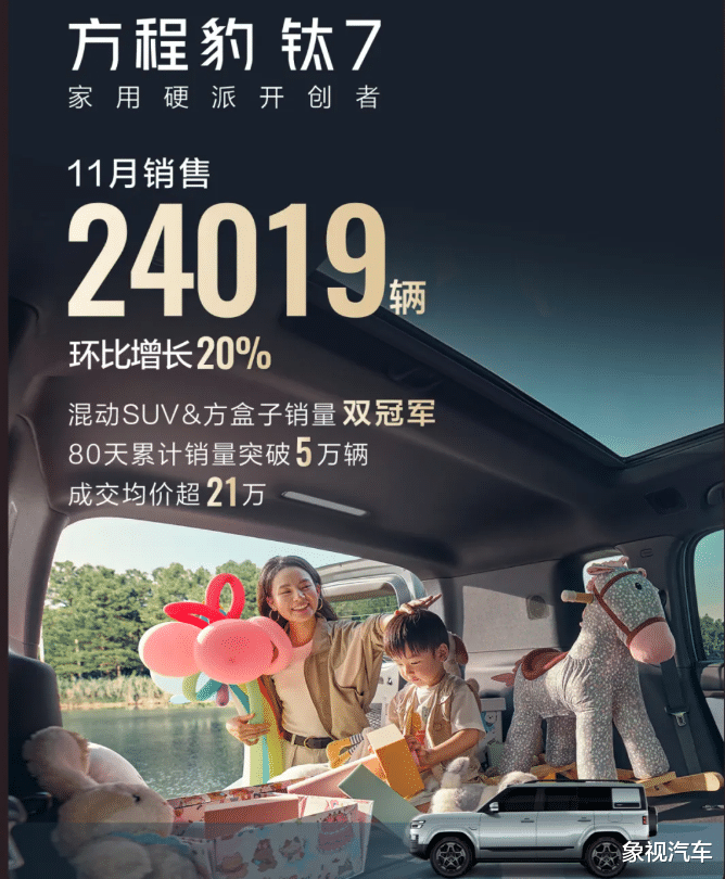 11月份,豹5、豹8和钛3的销量均不过万,反观钛7则热销24019辆。钛7一款车,在方程豹总销量中的占比超64.2%。