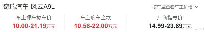 奇瑞风云A9L售价14.99-23.69万元,车主提车价为10.00-21.19万元,标配车型优惠了4.99万元,其实这款车的优惠力度没有这么大,只不过很多车主叠加了报废补贴或置换补贴,才能把终端价格做到10万。