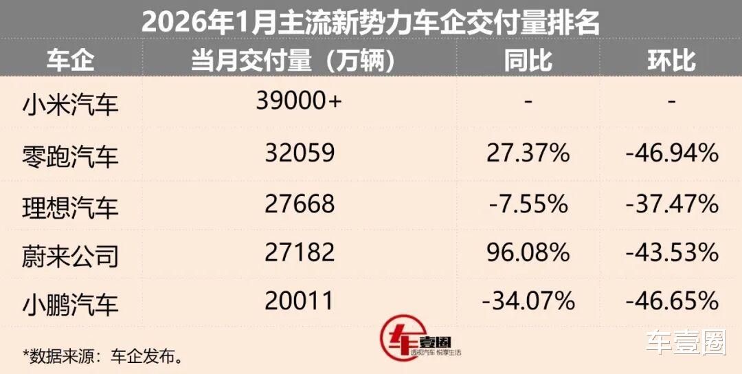 日前,各家车企/品牌相继发布了2026年1月之销量/交付量数据。这其中,“蔚小理”等主流新势力的表现又尤为引人注目。在小米汽车首次登顶月度交付量排行榜之同时,零跑、理想、蔚来、小鹏的环比跌幅都在4成左右。接下来,就让圈哥带大家一起先睹为快。