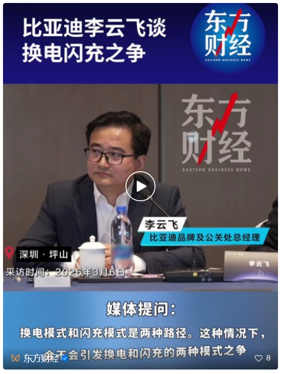 3月10日,据东方财经,比亚迪集团品牌及公关处总经理李云飞发文:看到网络上有很多关于闪充对电池寿命,闪充对电网的一些讨论,其实大家的担心也好,顾虑也罢,我们在电池研发阶段及储充方案初期就已经考虑过了,并有效解决。这次第二代刀片电池及闪充技术的发布会上,也都有提及,大家可以关注一下!