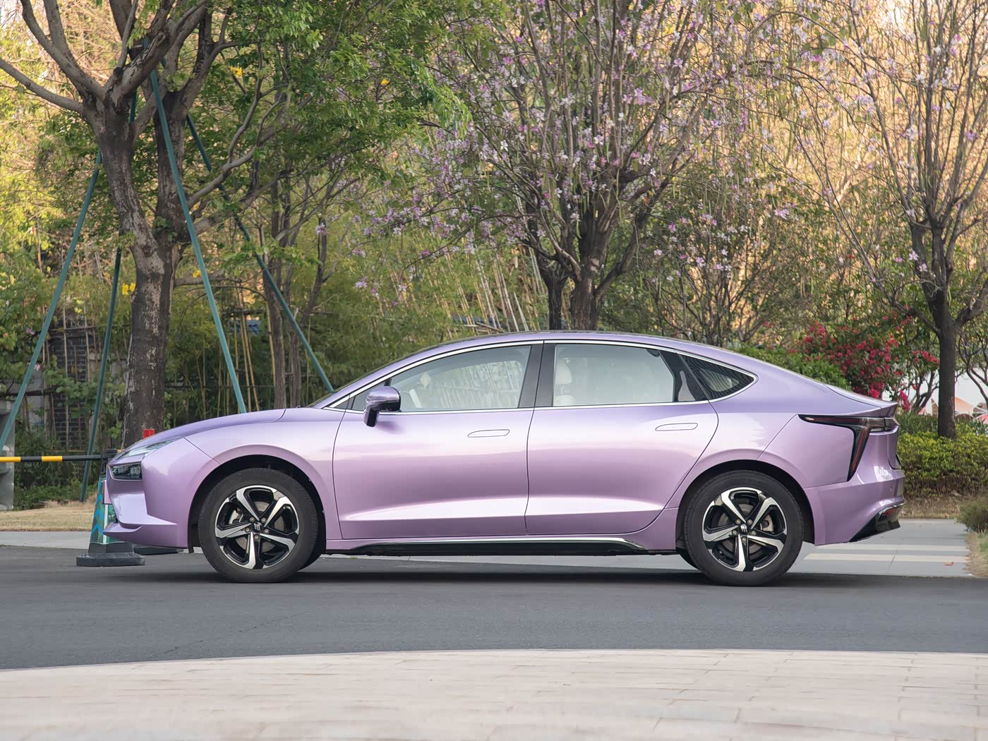 再来看车身侧面部分,羿驰05的车身尺寸为4675MM、1835MM、1480MM,轴距达到2750MM,在同级别车型中处于中上游水平,为车内空间奠定了良好基础。车身侧面采用溜背式设计,线条流畅动感,深受年轻消费者喜爱。圆润可爱又不失锐利的车身线条,搭配大尺寸厚壁轮胎,营造出强烈的运动氛围。 隐藏式门把手的设计不仅提升了车身的整体美感,还进一步降低了风阻。