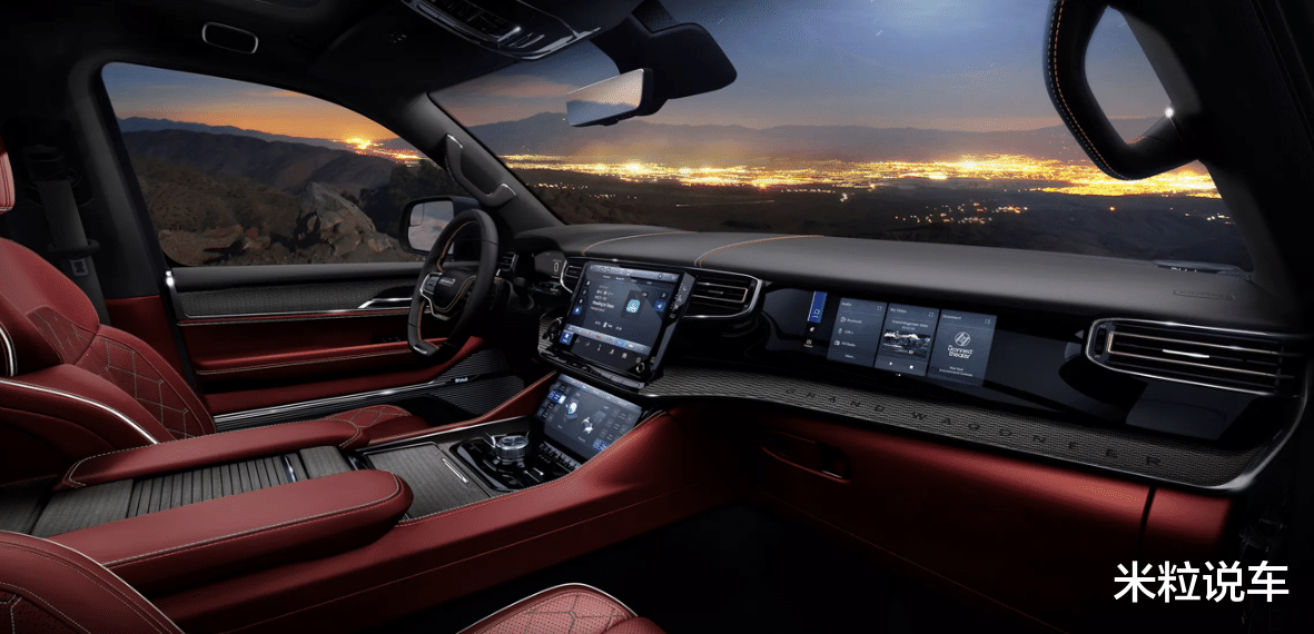 内饰设计很有意思,采用的是2+2+3的7座配置,还拥有全景大天窗。更关键的是,还有着红色的内饰,以及车内4块屏幕的配置。这款JEEP Grand Wagoneer是搭载了副驾驶娱乐屏的,这是JEEP旗下首次出现。此外,还匹配了HUD数字抬头显示功能,豪华音响以及L2级智能驾驶辅助系统。