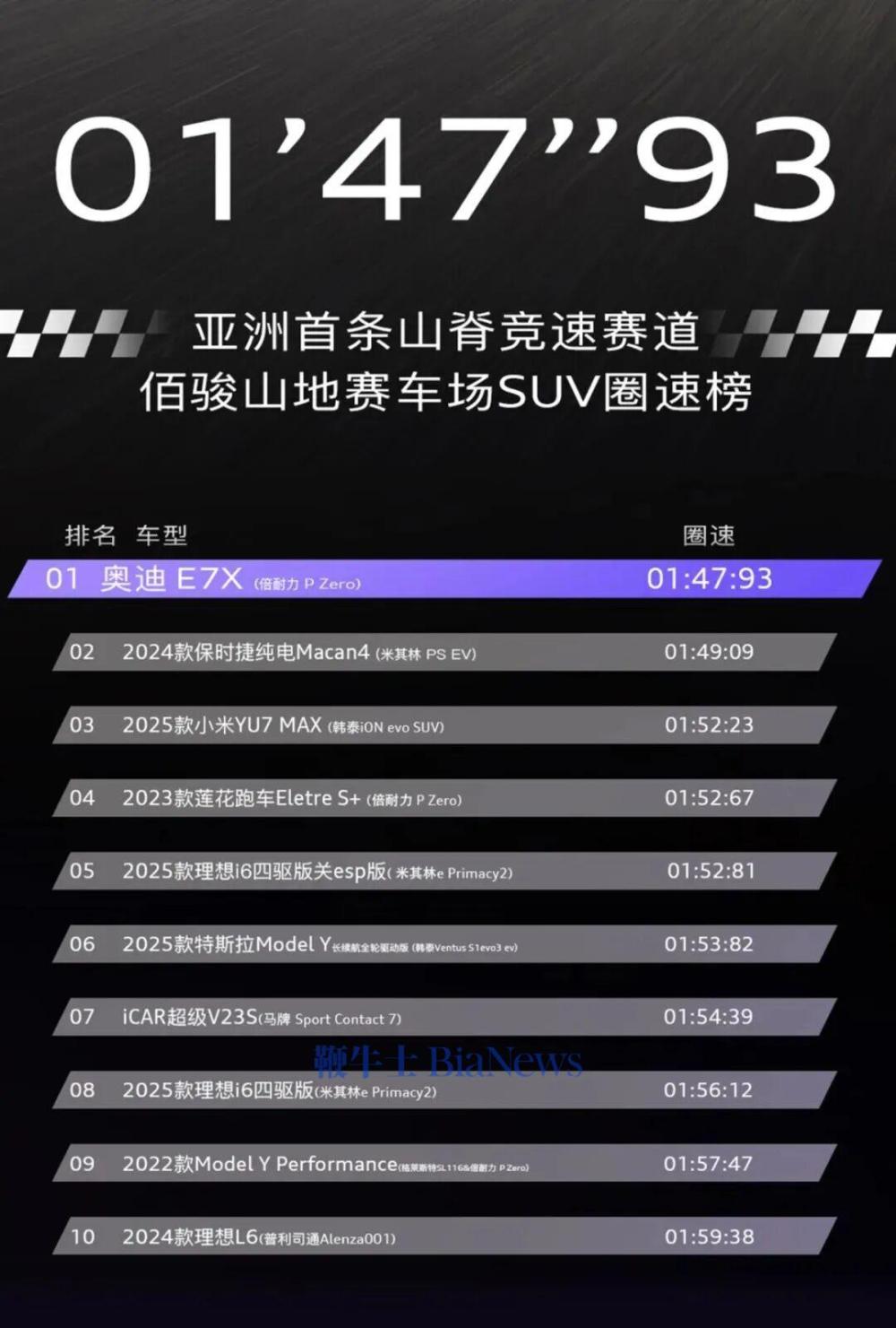 奥迪E7X的这一成绩超越了此前在该赛道创下纪录的小米YU7Max和保时捷Macan纯电版,成为当前SUV组别最快车型。