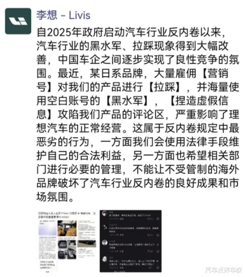 4月11日,理想汽车创始人李想在朋友圈连续发文,控诉某日系品牌在旗下新车NX8上市期间,雇佣营销号对理想i6、L6进行系统性拉踩,并动用大量空白账号“黑水军”攻陷理想产品的评论区。同日晚间,理想法务部也发布声明,宣布已完成取证并将通过法律途径追究责任。