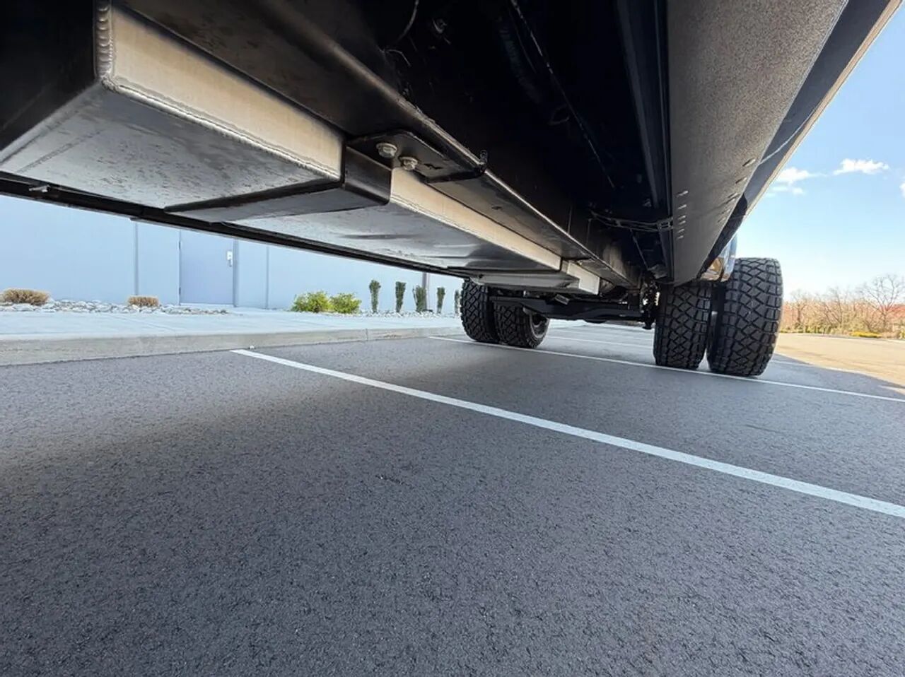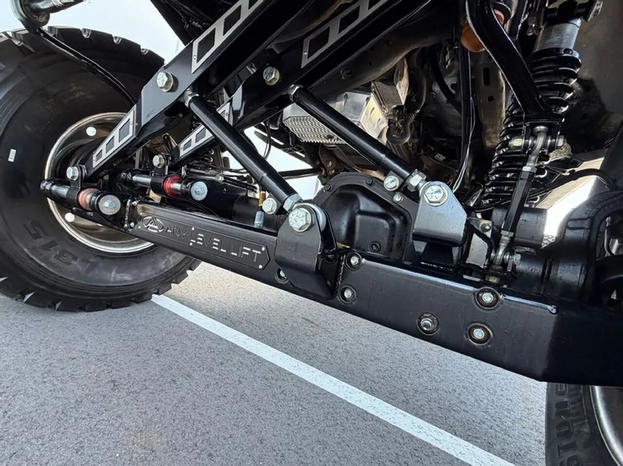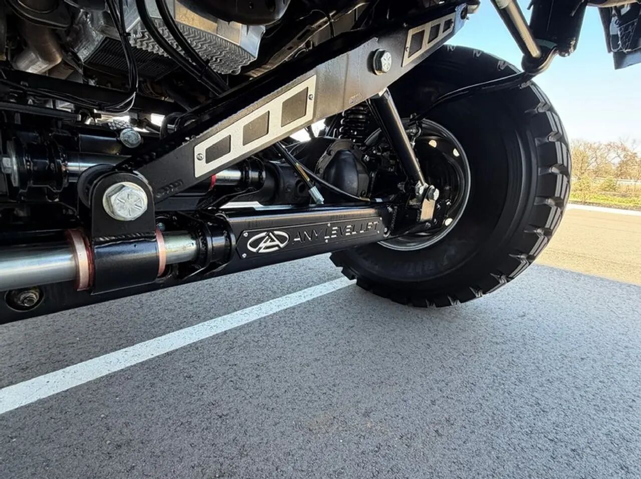 它最亮眼的改装当属定制悬架系统,可实现各车桥独立高度调节,既能呈现夸张的低趴姿态,完全举升时则装配 46 英寸巨型轮胎并采用后轮双胎布局,日常行驶或牵引时也可更换为更实用的 36 英寸轮胎。