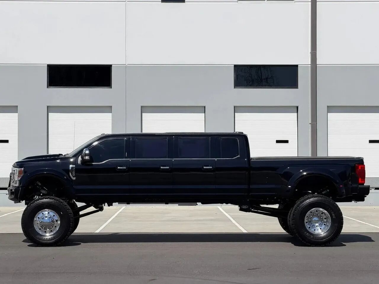 这台猛兽的原型本是 2020 款 Ford F-450 Platinum,原厂尺寸已然堪称巨无霸,可改装商 Stretch My Truck 显然不满足于此,对车架与车身进行了彻底加长,额外增加了一组车门与第三排座椅,最终打造出可容纳 11 名乘客的超大座舱,搭配 8 英尺货斗,车身体量直逼重型半挂。