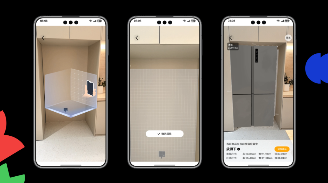 甚至京东鸿蒙版还有首发的全新功能,就是这个“高精度 AR 摆摆看 ”,可以用华为手机自由漫游 3D 场景,多视角查看整体的搭配,很适合装修的时候用。