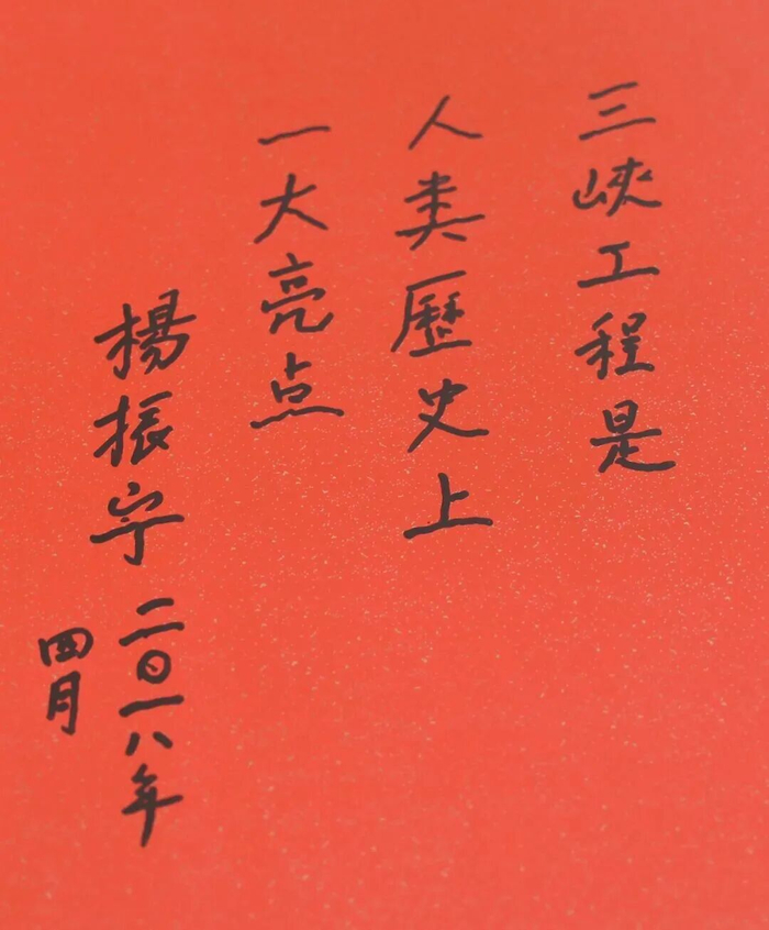 面对滔滔江水,宏伟的大坝,杨振宁心潮澎湃。在三峡工程展览馆,他挥笔题词:三峡工程是人类历史上一大亮点。