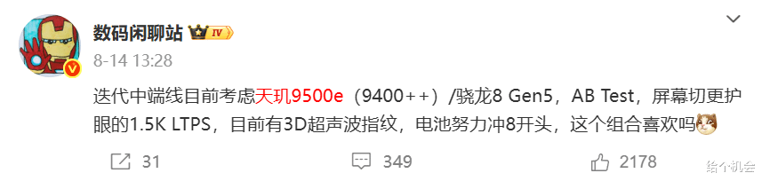 会采用一块更护眼的1.5K LTPS屏幕,尺寸大概还是6.78英寸左右,支持120Hz自适应刷新率和高频PWM调光,并且这次会给到超声波指纹解锁,补齐了这项功能,定位就感觉会更高一些了。