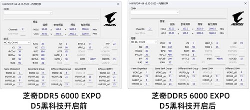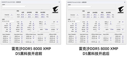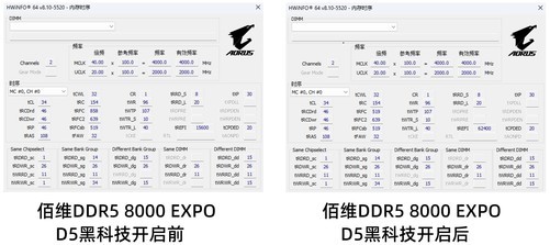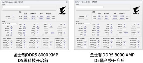 我们接下来给大家首先展示一下开启XMP/EXPO高频宽测试的这4款内存时序变化,同时我们打开这4款内存本身的EXPO/XMP预设,实现了XMP8000MT/s超频和EXPO6000MT/s超频。