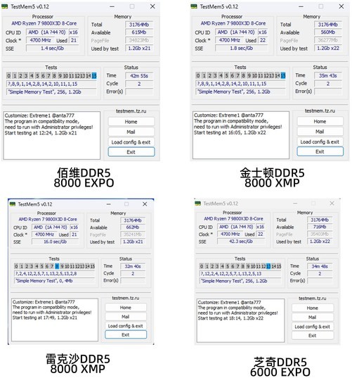 我们测试使用了anta777规则进行检验,而可以看到这4款内存都能经过TM5的30分钟以上压力测试,并且没有出现任何项目报错的情况。这体现了技嘉X870EAORUSMASTERX3DICE主板的强悍用料,能够支持自家BIOS的D5黑科技对于内存效能的提升,同时保证平台稳定性。