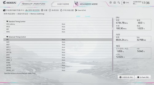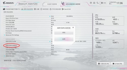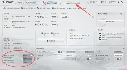 首先开机按F2或者DEL键进入到BIOS界面,技嘉BIOS主菜单中如果只开XMP/EXPO可以从左下角的选项中直接开启。而D5黑科技还需要点击上面的ADVANCEDMODE选项,进入高级界面中调节。