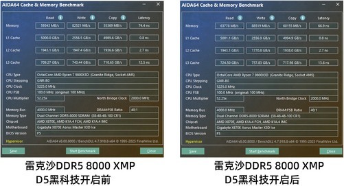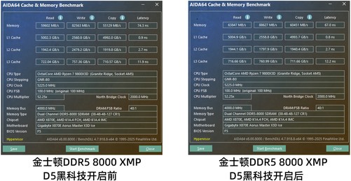 可以明显看到,在开启D5黑科技后,这些内存次级时序有了变化,主要改变了tRC、tRFC、tREFI三个小参,并且根据内存不同,调节时序的参数也略有不同,以达到具体问题具体分析的效果,并且保证平台稳定性。接下来我们在看一看D5黑科技开启后对于内存实际性能会有什么影响。我们下面通过AIDA64进行测试。