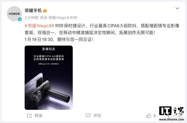 IT之家 1 月 15 日消息,1 月 15 日,荣耀手机官方宣布,荣耀 Magic8 RSR 保时捷设计首发行业最高的 CIPA 6.5 级防抖技术,并支持全新的增距镜专业影像套装。