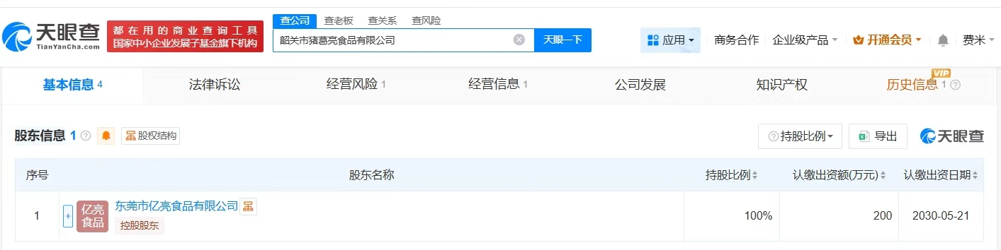 韶关市猪葛亮食品有限公司成立于2025年5月,法定代表人为周瑜,注册资本200万人民币,经营范围包括农业专业及辅助性活动、智能农业管理、初级农产品收购等。股东信息显示,该公司由东莞市亿亮食品有限公司全资持股。