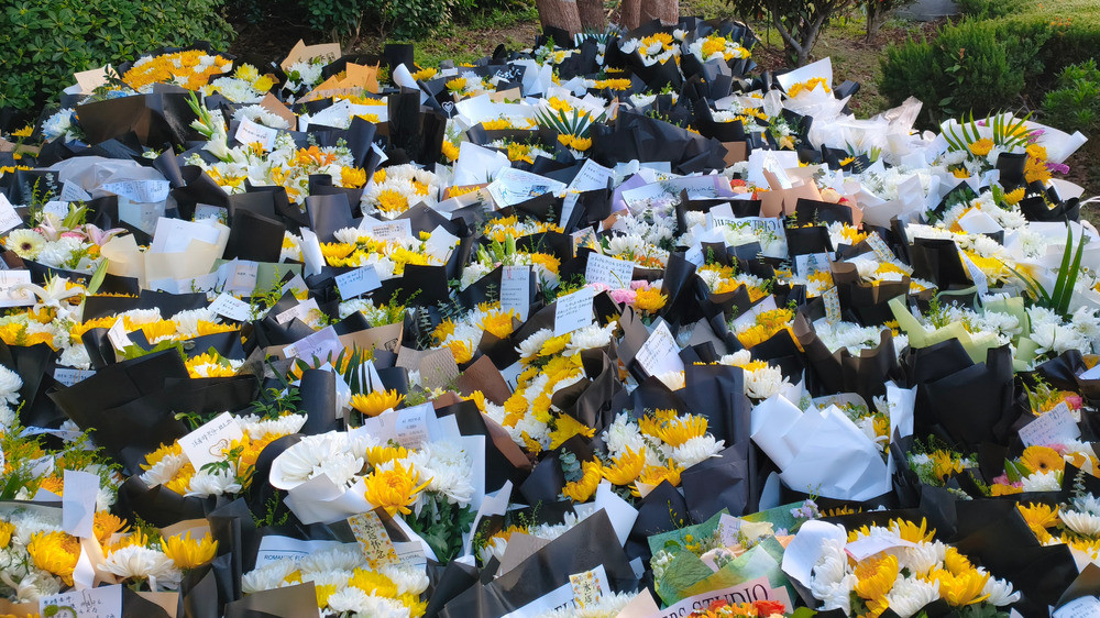 殡仪馆门口地面上摆满了很多苏州市民送来的花圈和花篮,附近鲜花店里的花束已经卖光,店员正在紧急调运。