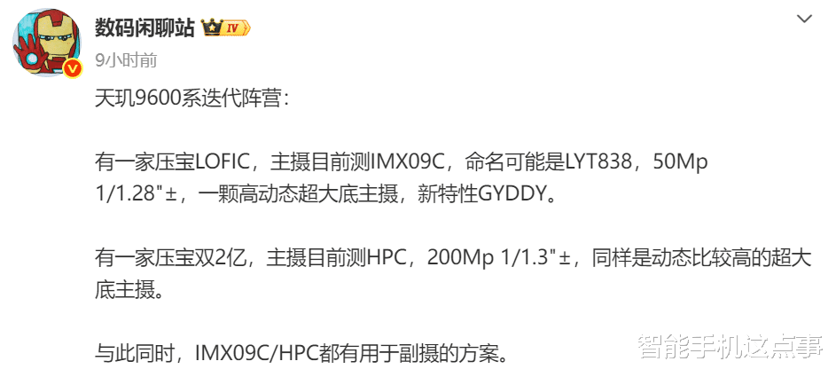 而且按照博主透露的信息,主摄采用的是索尼IMX09C(命名可能是LYT838),1/1.28英寸、5000万像素,搭配LOFIC技术。
