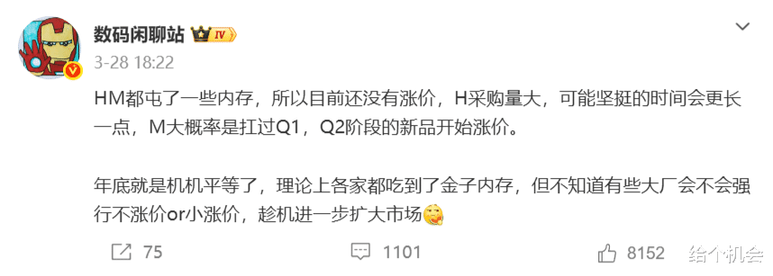 据博主数码闲聊站透露,华为和小米都屯了一点内存,所以目前还没有涨价,而华为采购量比较大大,可能坚挺的时间会更长一点,小米则在扛过Q1之后,4月份的新品就会开始涨价了,其他友商就更不用说,一加、vivo、oppo都疯涨了一波,接下来的新机可能不太好卷性价比了,不过红米k90至尊版、一加ace 6至尊版这两款手机仍然会走性价比路线,只要不涨太多也是很不错的,大家可以等等看。
