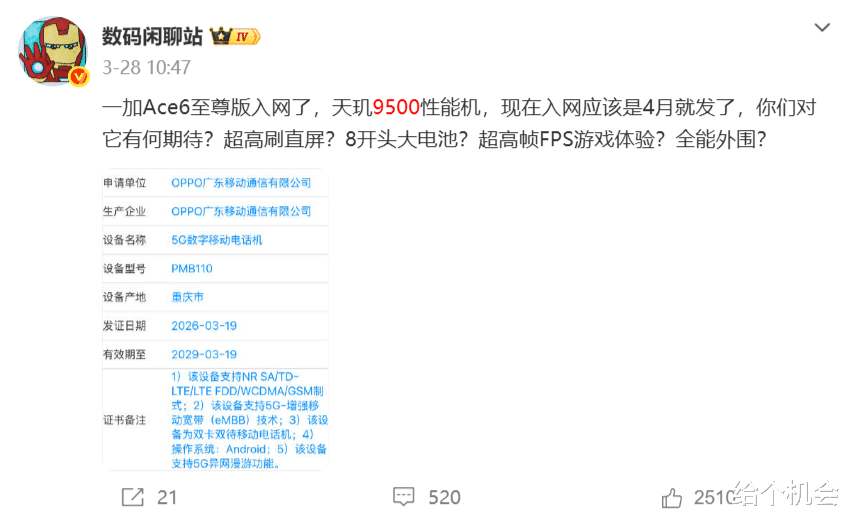 以往大概是6月前后上市,现在提前到了4月份,近期一加ace 6至尊版和红米k90至尊版都已经入网,预计4月中旬就会发布,追求高性价比、高性能的用户可以等等。