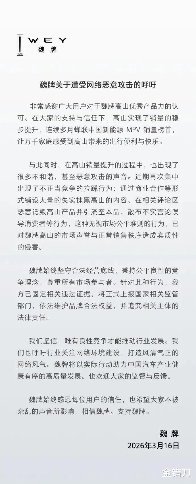 面对恶意攻击,魏牌并未选择沉默,而是拿出了坚定的维权态度。2026年3月16日,长城汽车旗下魏牌正式发布《关于遭受网络恶意攻击的呼吁》声明。