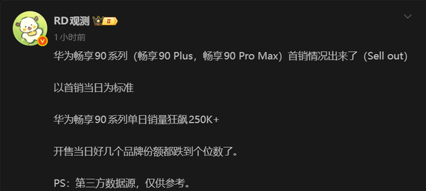 [CNMO科技消息]4月5日,数码博主@RD观测爆料称,华为畅享90系列(畅享90Plus,畅享90ProMax)销量表现强势。爆料显示,该系列手机以首销当日为标准,单日销量突破25万台。开售当日,多个品牌市场份额受到影响。