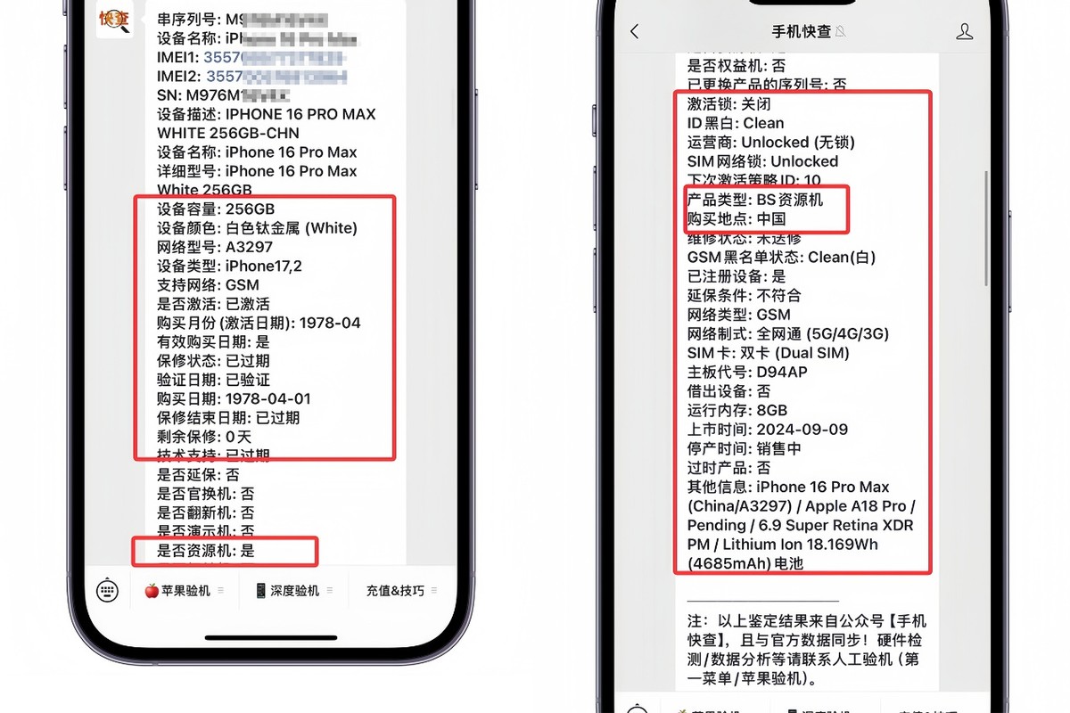 比如某检测平台上,就可以看出他们轻松检测出了一台苹果iPhone16 ProMAX,并且清晰标注出了是资源机,购买日期1978年4月1日等信息。如果成色非常新,并且确定是资源机,那还是值得考虑的。