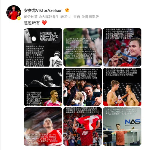 这位丹麦名将还在社媒用中文写下催泪长文,感谢了生涯中共事过的教练,OBK俱乐部、丹麦羽协,还有一直以来始终支持他的球迷。