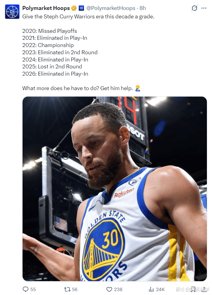 库里也遭到了多方的嘲讽,美媒LH:这一次斯蒂芬-库里看起来真的像38岁了。