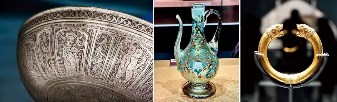 来到中国的伊朗文物:左起恺伽王朝银碗(局部),装饰伊朗年轻女性、情侣及兔子和飞鸟图案(图/受访者提供);公元16世纪萨法维王朝的“花卉纹玻璃壶”(图/受访者提供);公元前550—前330年阿契美尼德王朝的“黄金狮首授权环” (摄影/本刊记者 刘文华)
