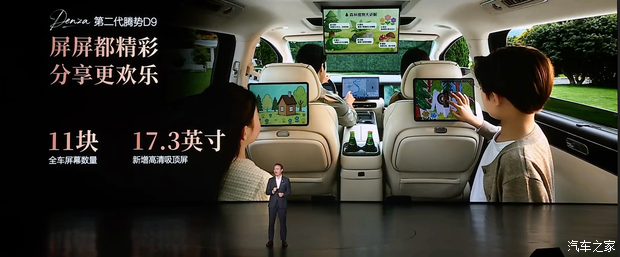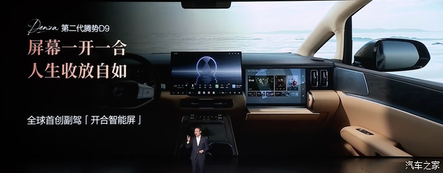 来到车内,第二代腾势D9进行了比较大的升级,其中比较引人注目的是其车内最多可以提供10块屏幕,其中前排分别提供10.25英寸液晶仪表、21英寸HUD抬头显示、15.6英寸中控屏、流媒体后视镜以及15.6英寸副驾屏,值得一提的是,其副驾屏为开合式智能屏,不仅可自动适配屏显,下方形成的小桌板还可承重5kg,丰富更多用车场景。后排方面,新车还会提供17.3英寸吸顶屏、双磁吸头枕屏和双二排座椅触控屏。