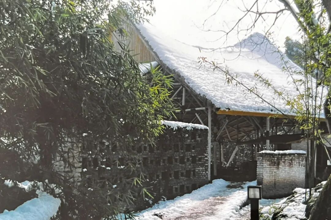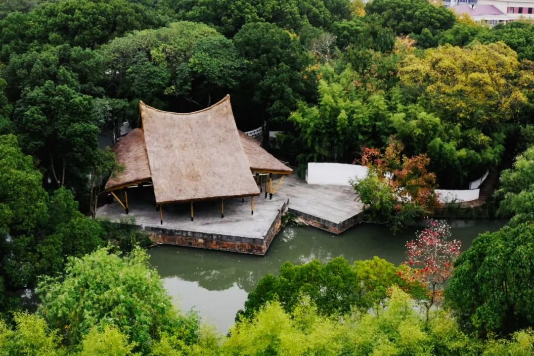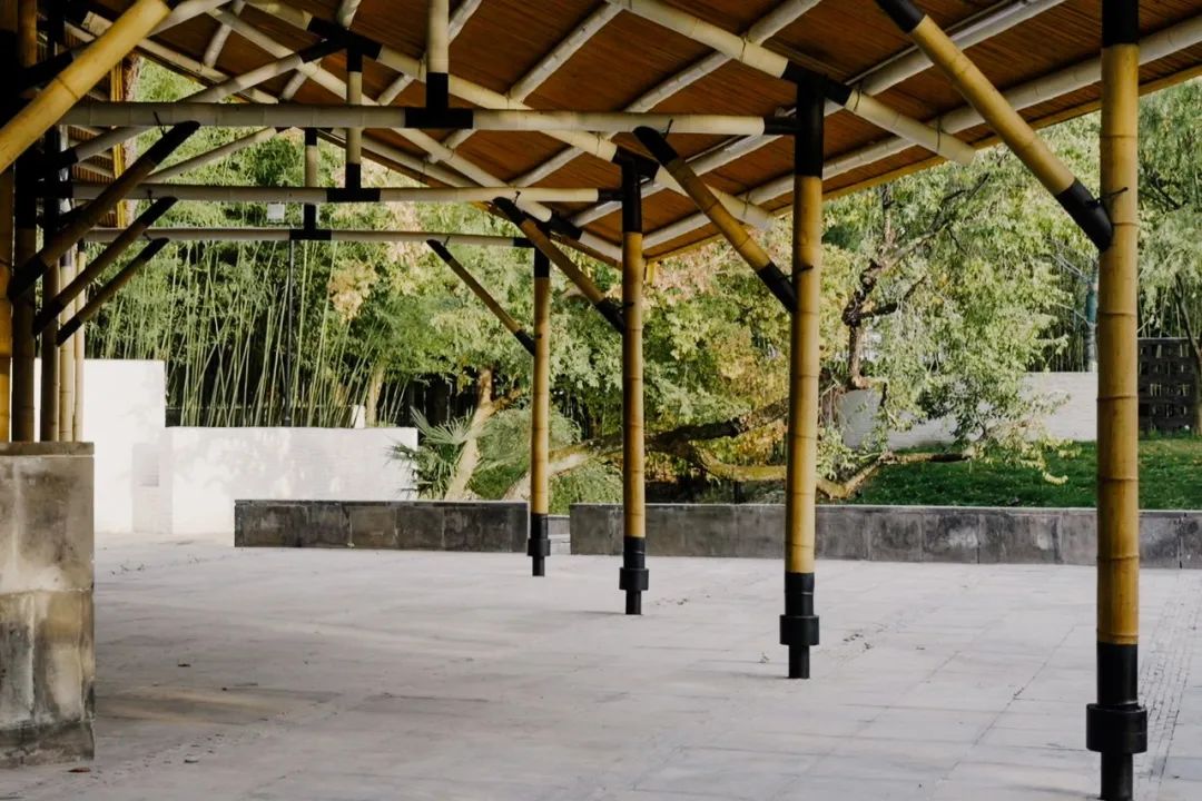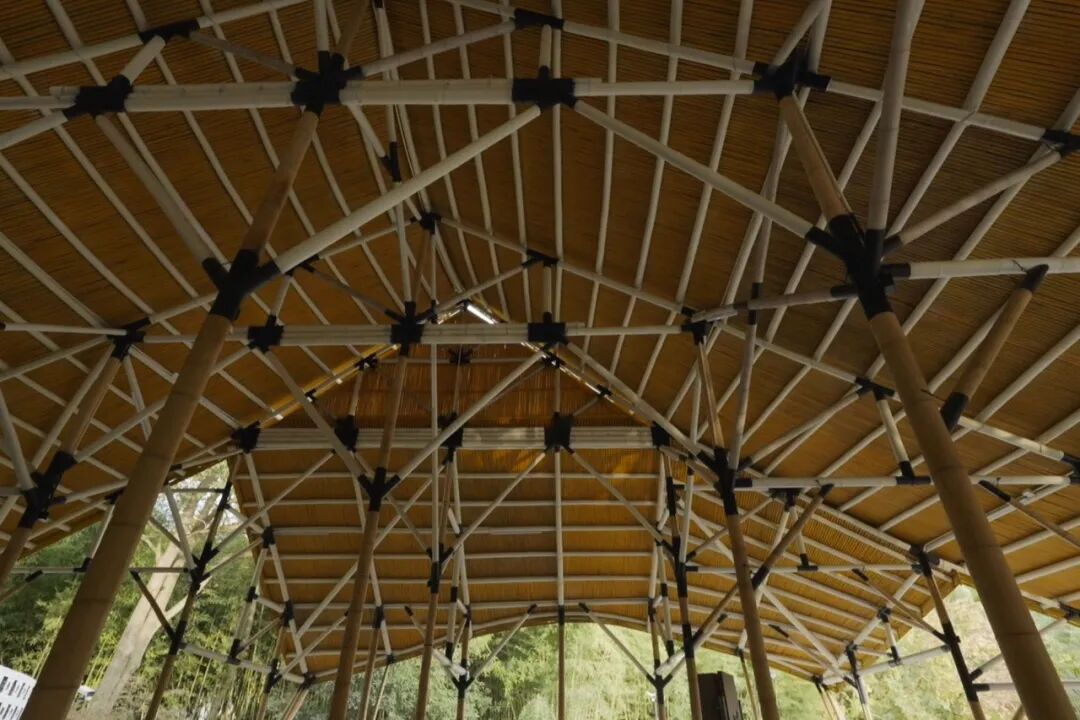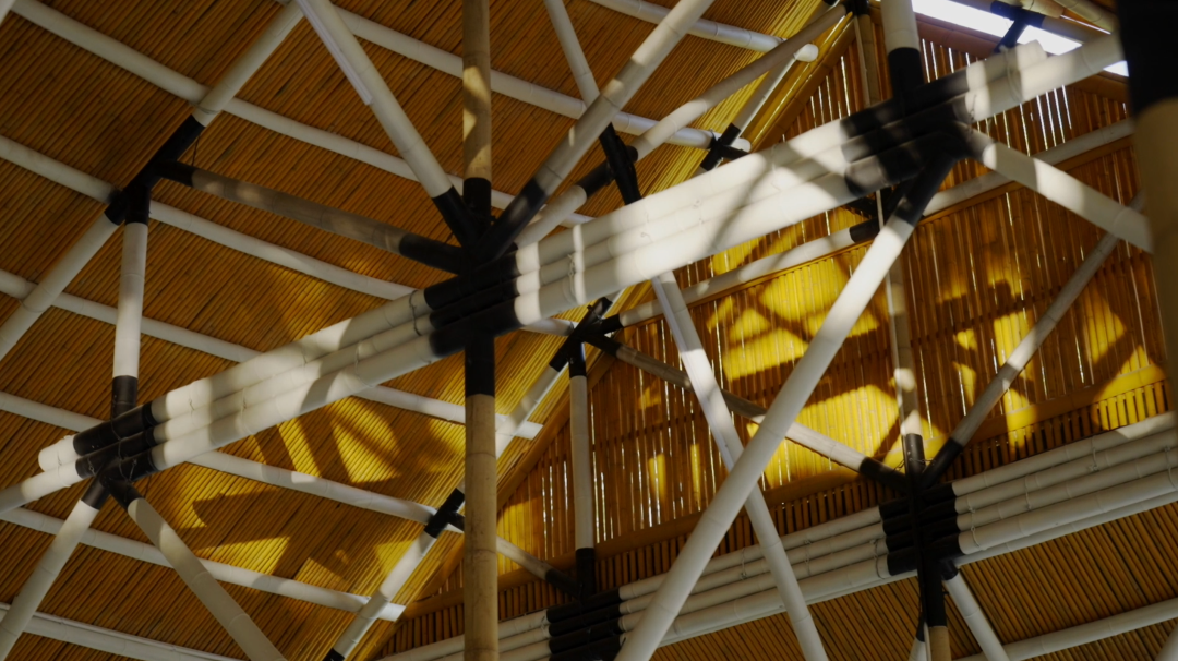 它是用非常纤细的竹子支撑起了一个巨大的屋顶,竹子的节点涂上了黑色的漆,其他的部分是涂上了白色的漆。黑色的节点,跟暗色的茅草的屋顶组合在一起,就像往上漂浮,往上飞起来,一种非常当代的设计语言了。