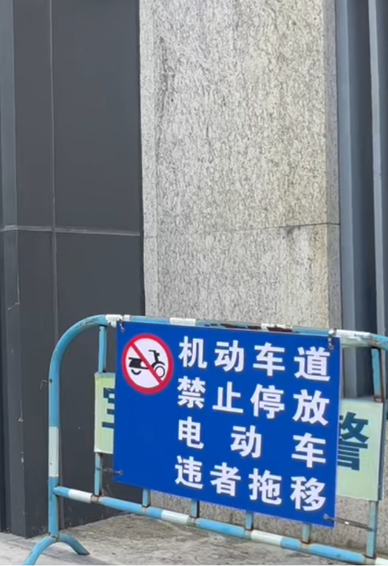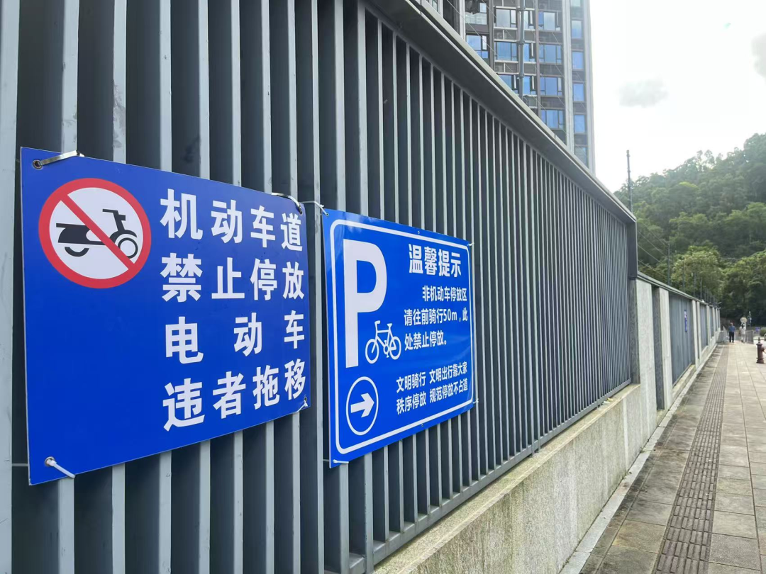 在电动自行车管理方面,此前常见的沿街随意停放现象已得到明显改善。在小区出入口和人行道围墙上,多处张贴着醒目的停车指引标志。