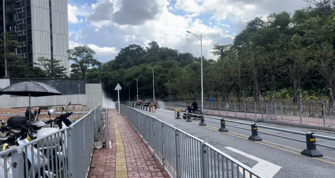 记者在现场看到,大井山路上加装了整齐的物理围挡,清晰划分了双向车道,两侧预留的人行道也用护栏进行了隔离。该路段靠近小区与学校,高峰时期人流密集。