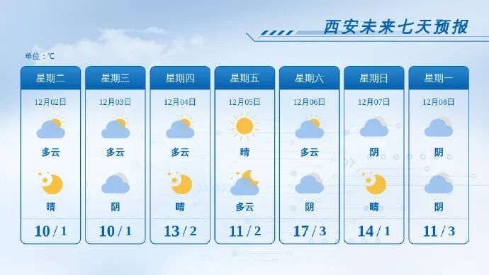 据西安气象消息,本周西安市以晴到多云天气为主,受弱冷空气影响,最高气温维持在9~13℃,最低气温在0~3℃;其中2-3日有4-5级左右阵风。
