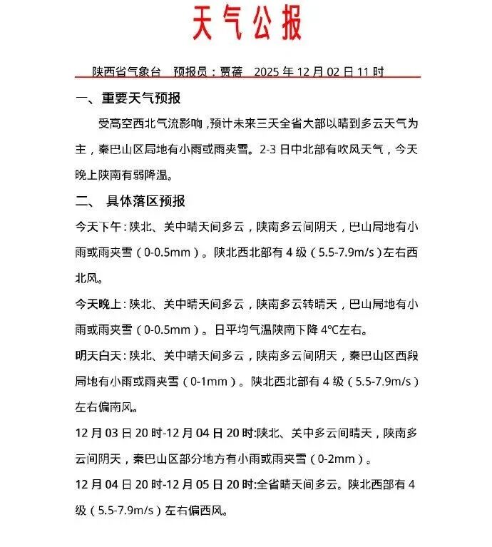 12月2日,陕西气象发布重要天气预报,受高空西北气流影响,预计未来三天全省大部以晴到多云天气为主,秦巴山区局地有小雨或雨夹雪。2-3日中北部有吹风天气,今天晚上陕南有弱降温。