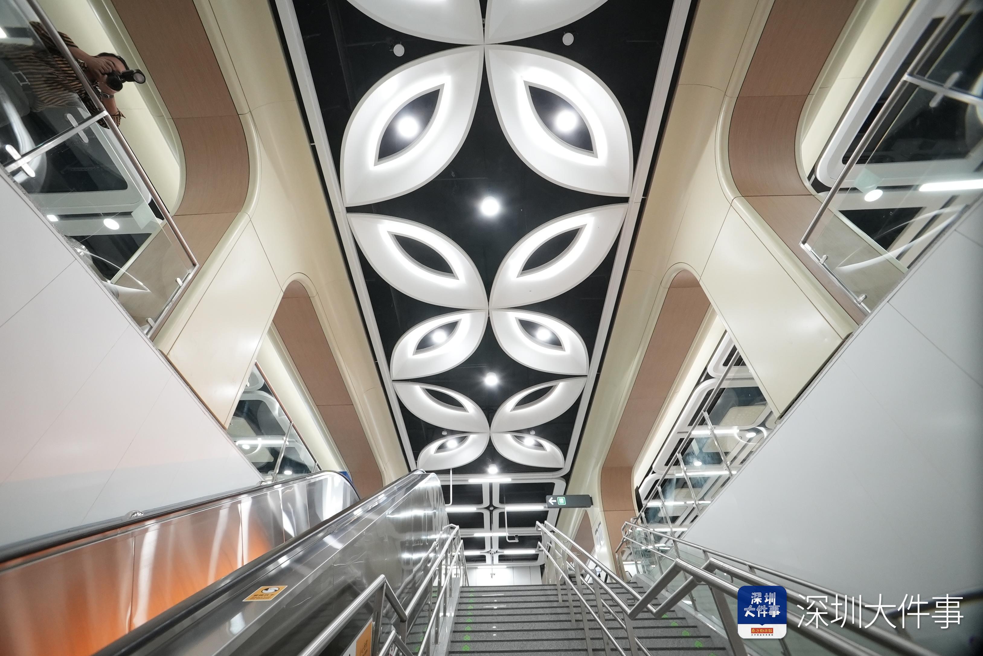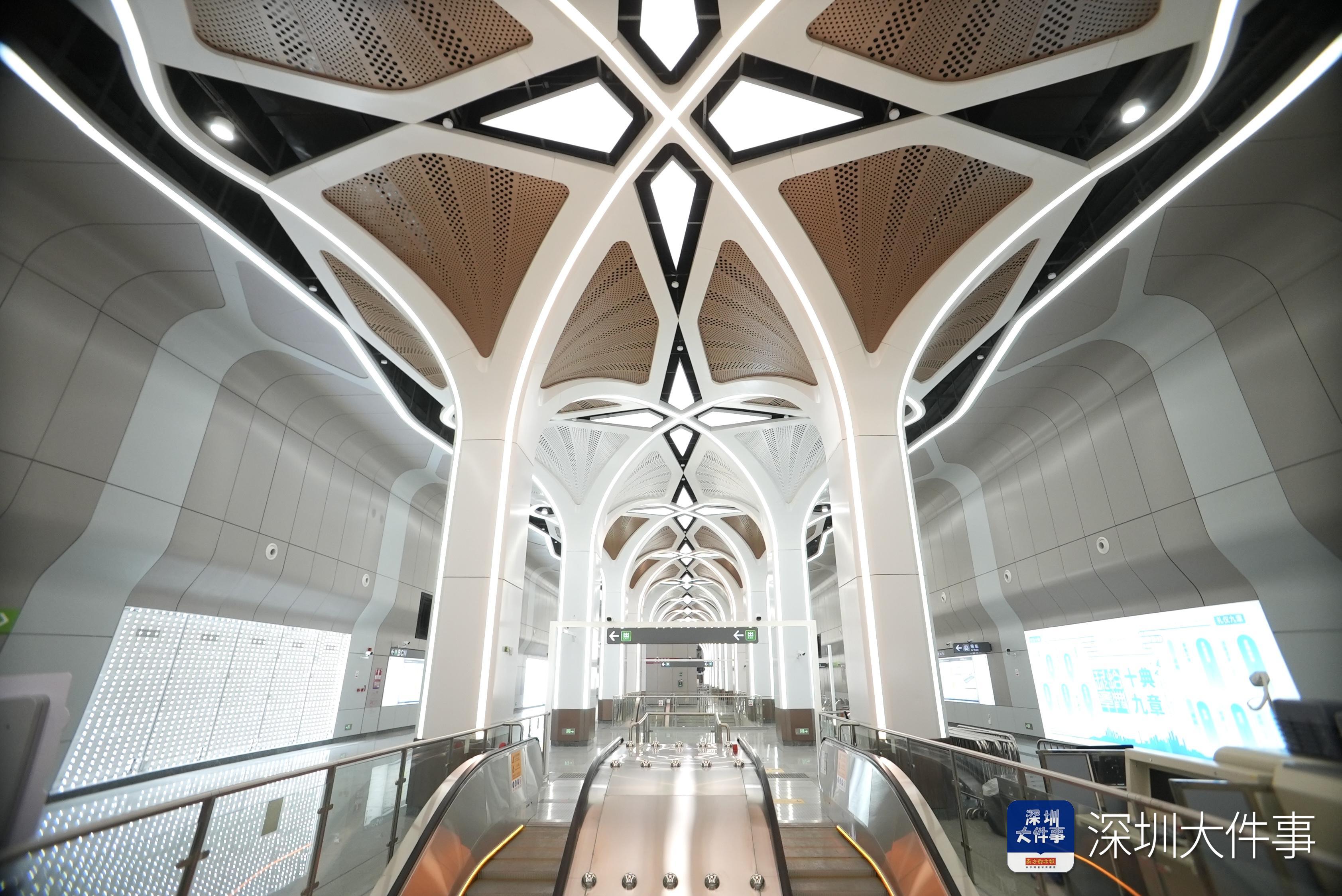 特色站石鼓站毗邻大疆天空之城总部、鹏城实验室、万科云城设计公社等,具有科技创新和艺术创意的文化特征。车站以“无人机”为设计灵感,将机翼、机身的形态,抽象转化为标准化、模块化的装饰单元,构筑出车站空间的主体框架,宛如一架巨型穿梭机,车站立柱犹如科技之树,向上生长,寓意城市的蓬勃发展。
