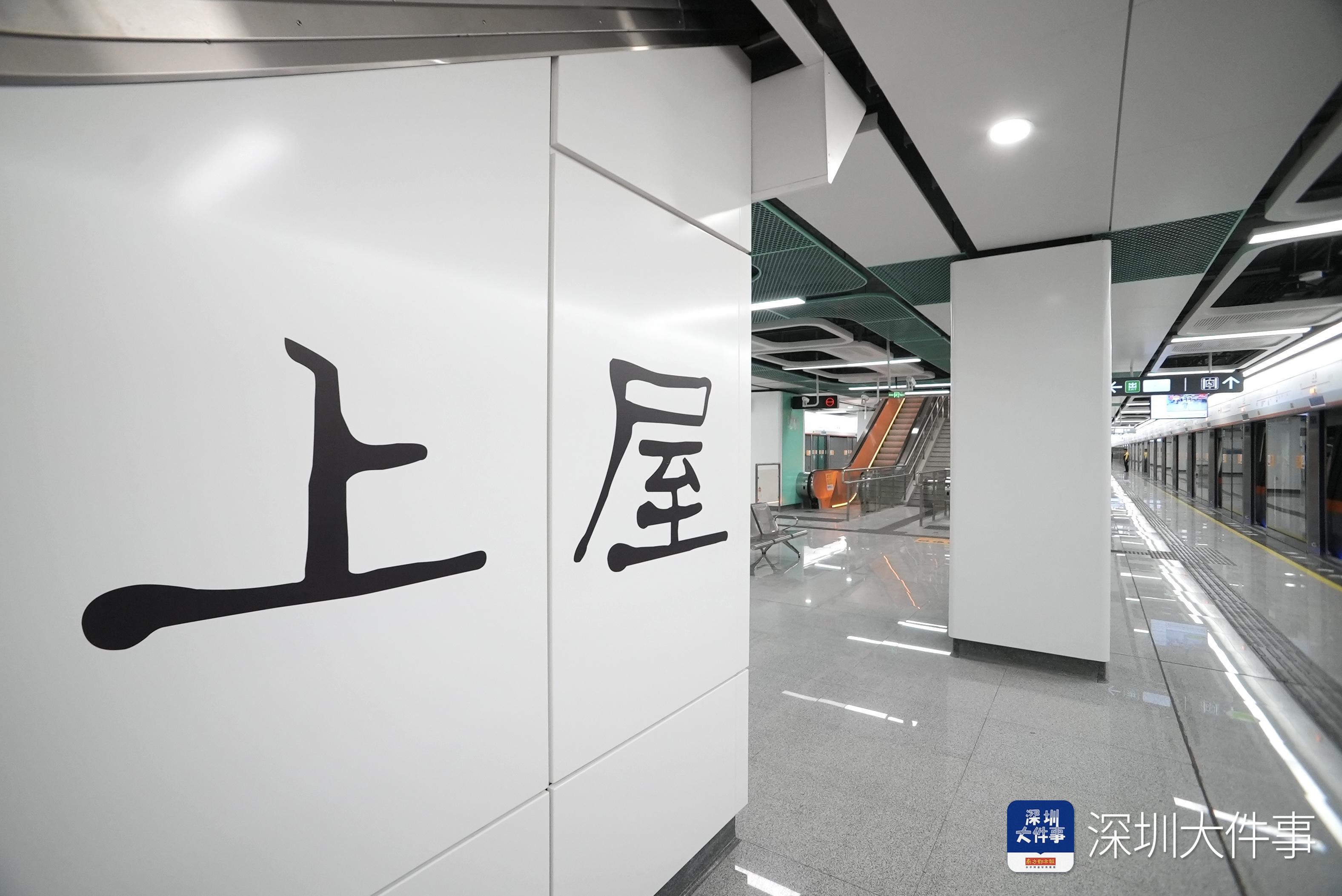 上屋站为标准站,车站以线路科技和生态特征为切入点进行设计,采用绿色为分段主题色彩,运用折线空间线条,天花中的方框造型如城市的窗口,由深圳特色建筑群组成的天际线冲孔图案有规律地间隔布置在方框中,象征着地铁网络与城市环境的融合。