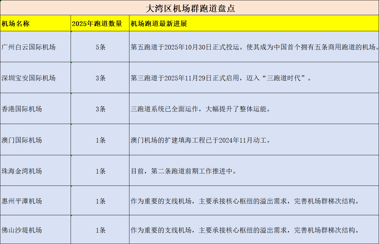 白云机场的崛起并非孤例,而是粤港澳大湾区机场群集体跃升的缩影。目前,大湾区汇集了广州、深圳、香港三大国际枢纽机场,珠海、澳门两座干线机场,以及惠州、佛山两座支线机场。近期,随着白云机场第五跑道和深圳机场第三跑道投用,加上早已全面运作的香港机场三跑道系统,大湾区投入使用的跑道数量迈向15条,成为全球机场跑道密度最高的区域之一,“航线上的大湾区”备受关注。