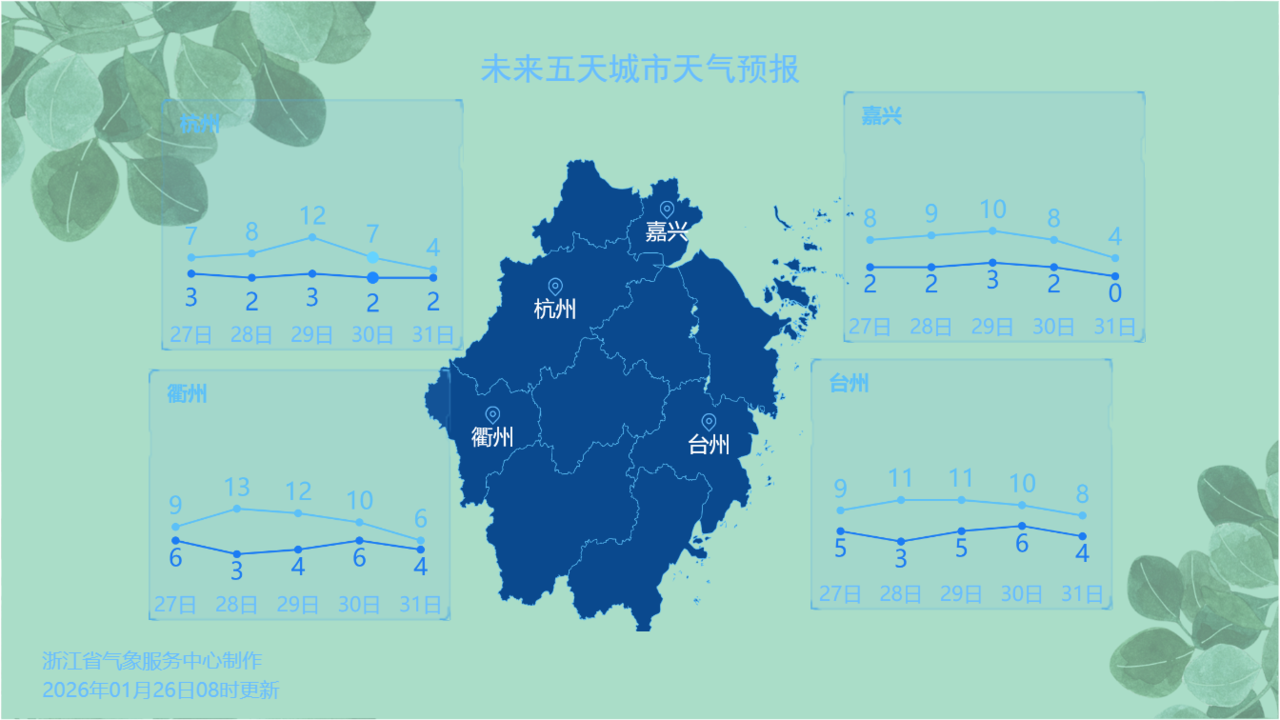 尽管早晨起步气温并不算低,但在弱冷空气压迫下,昨天(1月26日)午后,浙北北部地区最高气温被打压至9-11℃之间,其中长兴仅9.1℃。而冷空气鞭长莫及的浙中南一带则依旧沉浸在和“大寒”节气完全背道而驰的温暖里,最高的文成有24.9℃。