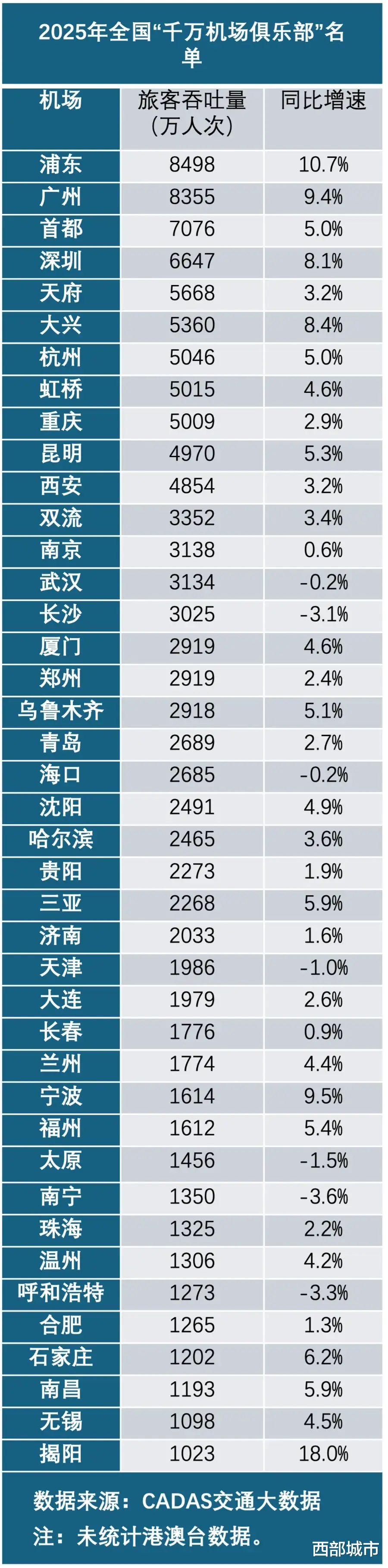 随着2025年武汉天河吞吐量被南京禄口反超,中部城市已整体无缘航空流量前十。