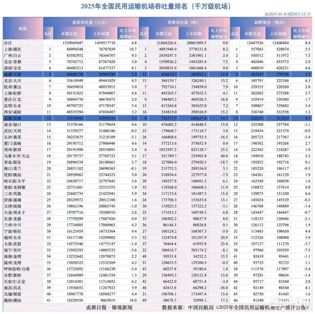 而自西安咸阳开始,差距拉大。排名其后的成都双流机场2025年吞吐量仅3300万人次——此前双流机场曾一度突破5000万,长期位列全国第四,后因天府机场分流才出现变化。