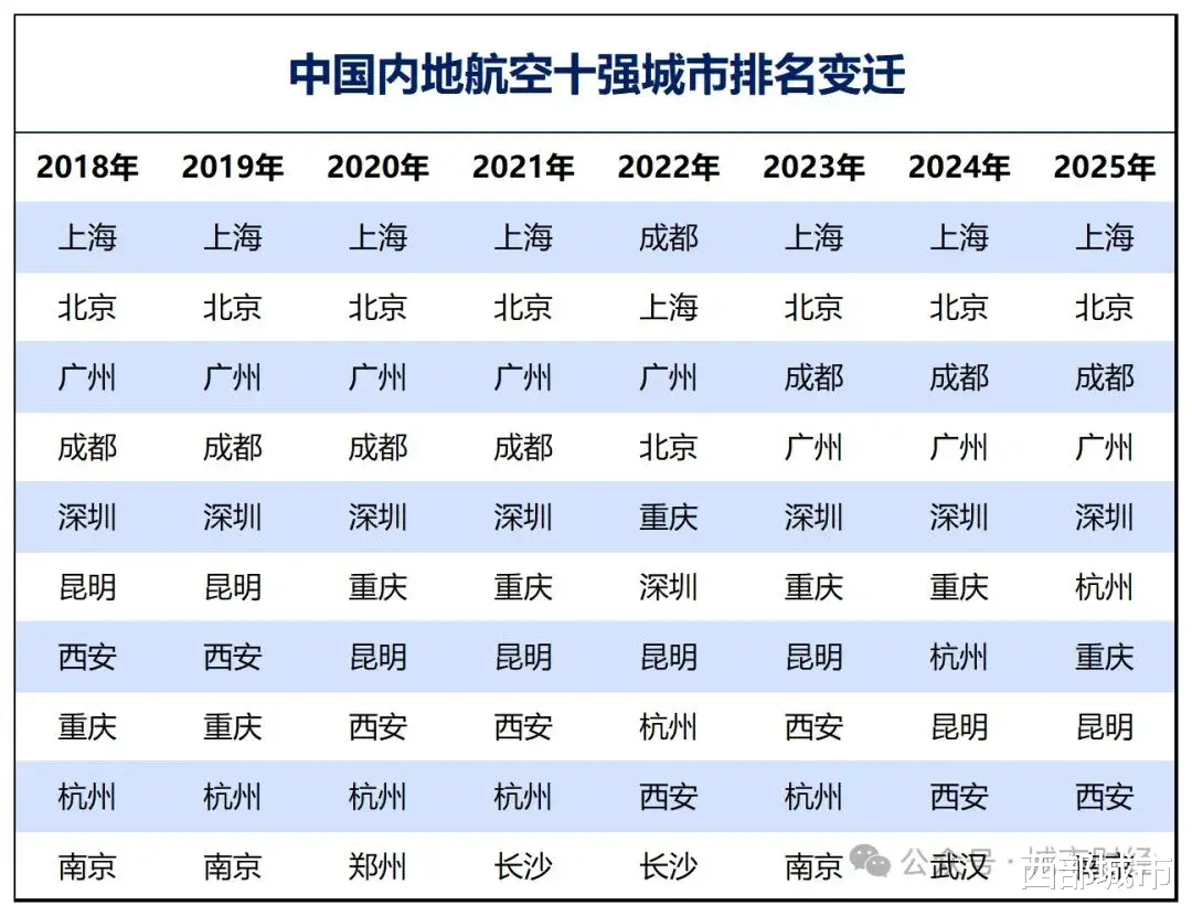成都反超广州,跻身前三;重庆、深圳、杭州围绕“航空第五城”展开角逐;西安、昆明排名有所下滑;武汉、南京争夺十强席位。