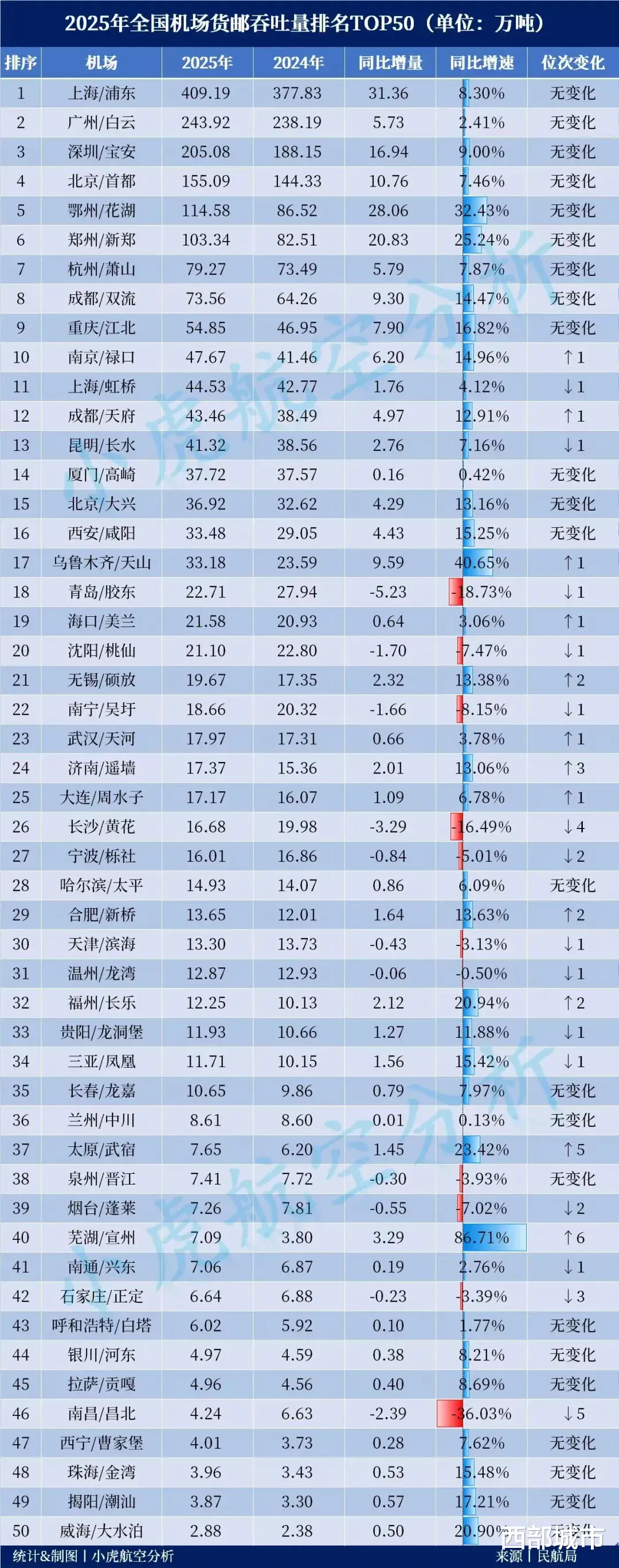 此外,杭州萧山、成都双流、重庆江北货邮吞吐量均超50万吨。