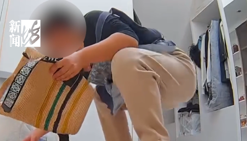 张女士在储物间临时加装的摄像头,也记录下了3月21日的一幕,李某在4楼储物间翻箱倒柜之后,拿走了一个名牌包袋。