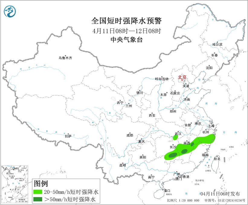 预计4月11日08时至12日08时,江南中部等地的部分地区将有8级以上雷暴大风或冰雹天气,其中,湖南南部、江西东部等地的部分地区将有10级以上雷暴大风,最大风力可达11级以上;江南中部等地的部分地区将有小时雨量大于20毫米的短时强降水天气,其中,湖南南部、江西中部等地的部分地区小时雨量大于50毫米。